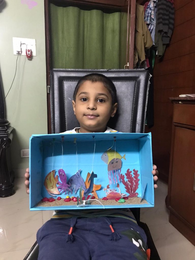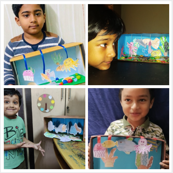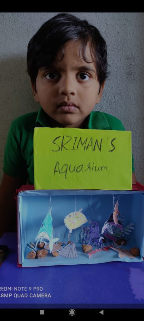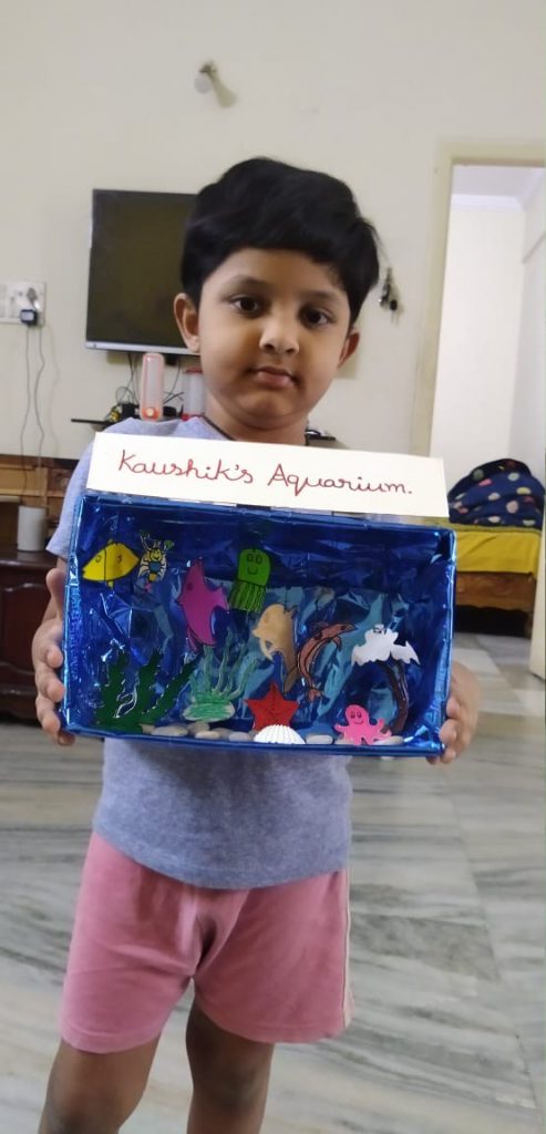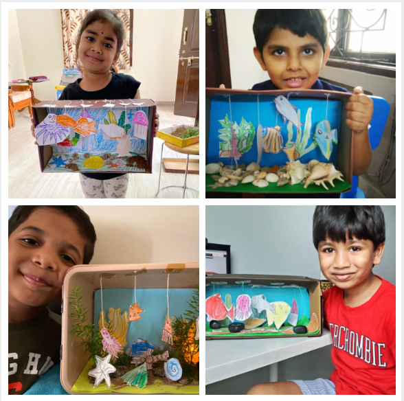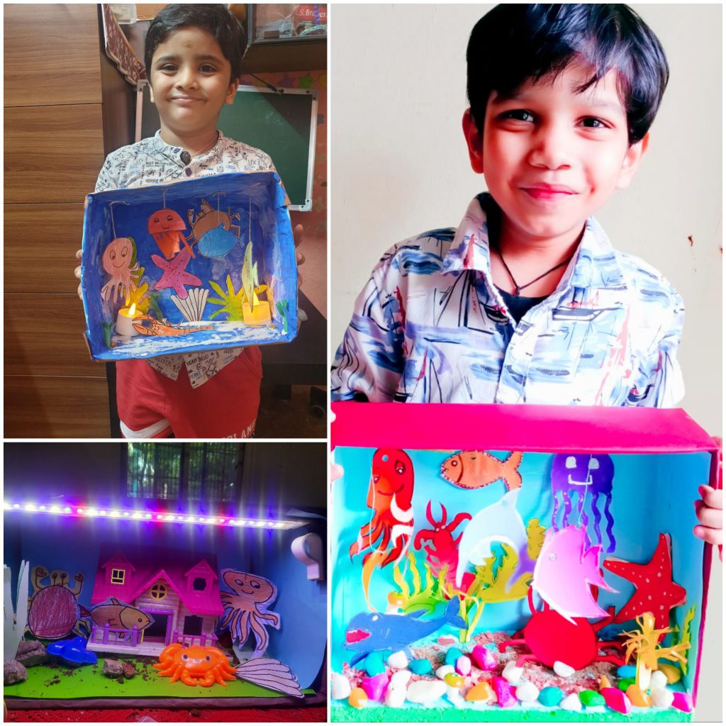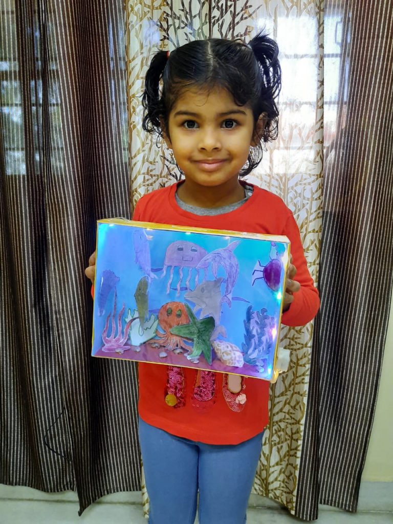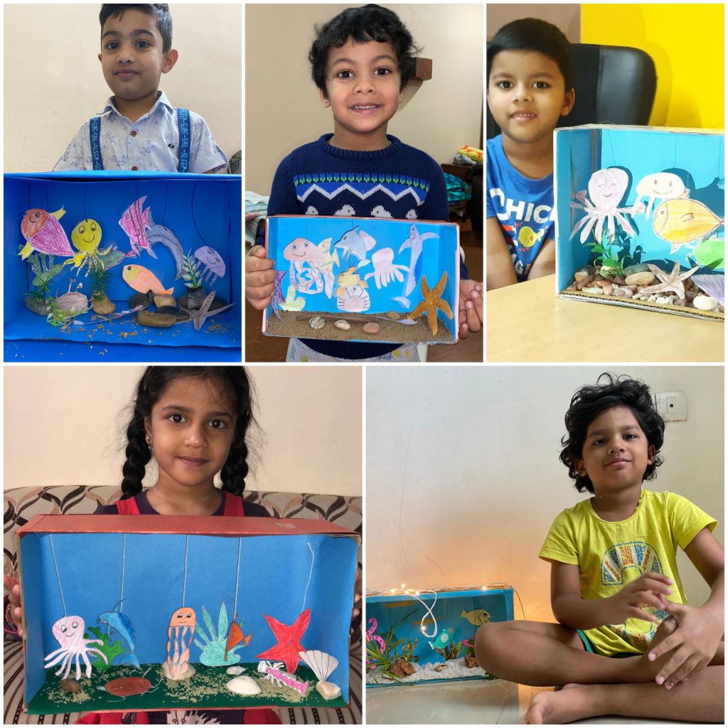 It is a known fact that children love to play in water. Water stimulates all the senses specially touch, sound and sight. Their love for water and the underwater animals is endless. On December 4 th PP2 children celebrated ‘Underwater animals’ day’. Children were shown interesting videos and presentations to give them a picture of life underwater. They were shown interesting facts about a few aquatic animals. They drew and coloured their favourite underwater animal. They made an aquarium with a shoe box and hung the aquatic animals that they drew thus having their own personal handmade aquarium.