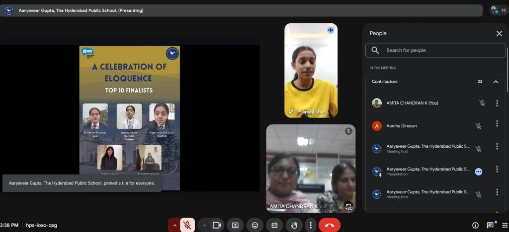 The preliminary round of judging the entries was done by School AFS Coordinators, Ms Amita Chandran K and Ms Shamala.  The  submissions were adjudicated using a prepared judgment sheet incorporating rubrics and automatic score compilation. Ten finalists were shortlisted. These students, accompanied by their AFS coordinators  participated in a live final round via Zoom.  Finalists delivered  a two-minute speech on a topic provided 12 hours in advance. The topic was ‘ Quality Education is Not a Privilege, But a Fundamental Right’