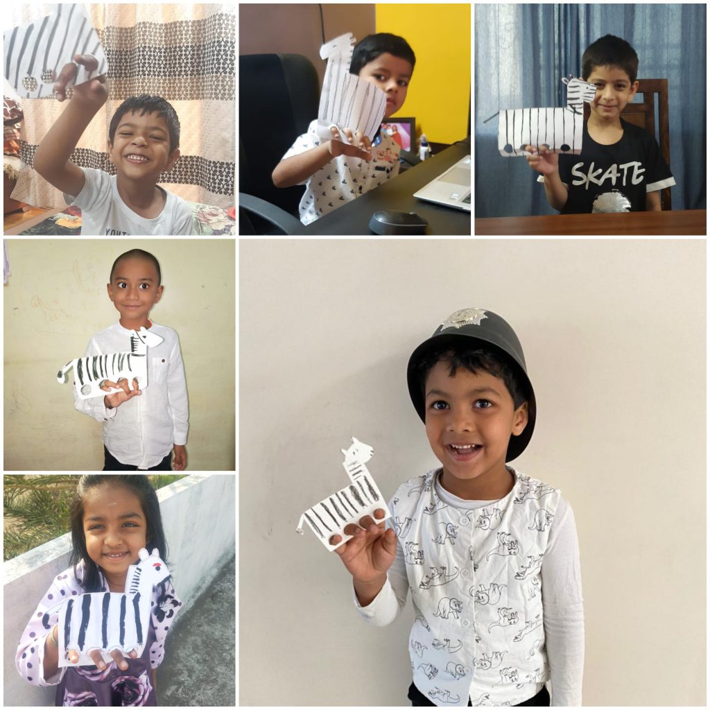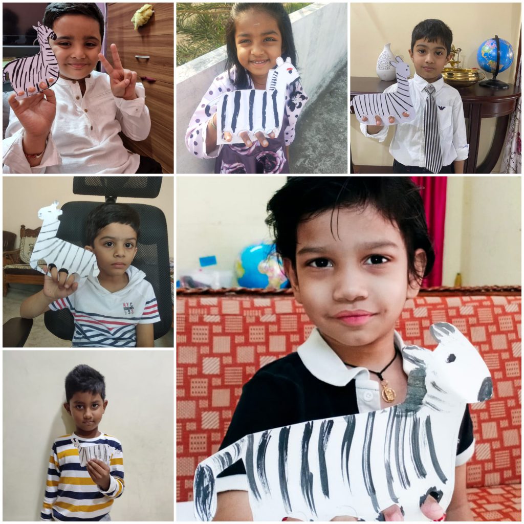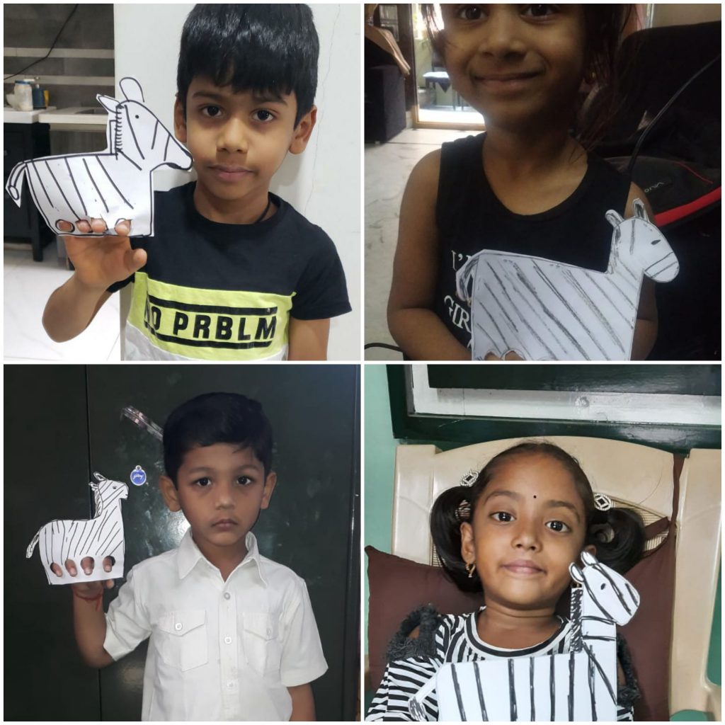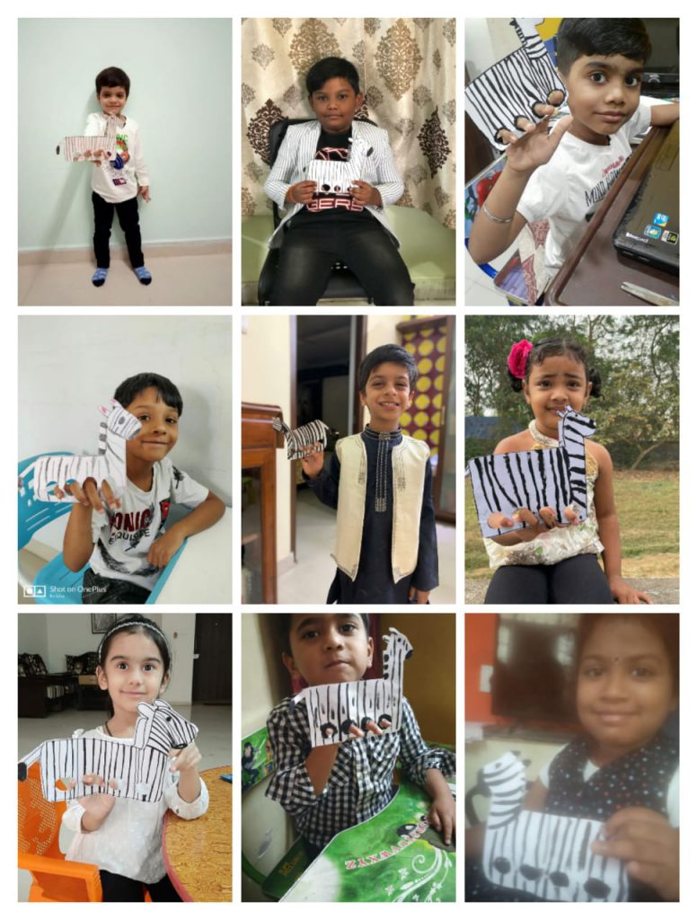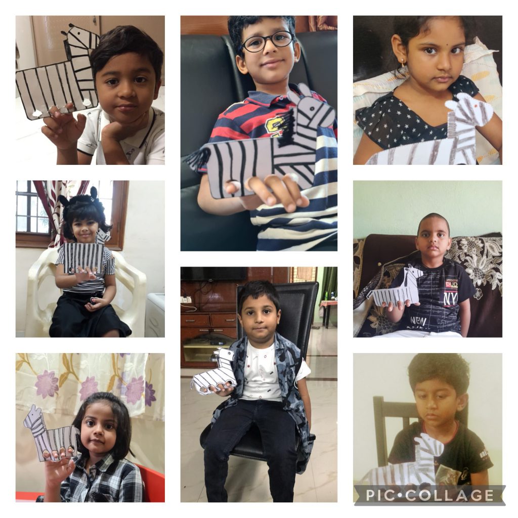 PP2 children learnt different things about black and white colour. A presentation about animals and things that are commonly seen in black and white was shown. Rhymes were also shown on white and black and few interesting facts about these colours were shared with them. As part of black and white day craft activity, a finger puppet of zebra was made in the class. After making it, they sang a rhyme on zebra with the finger puppet on their hand.