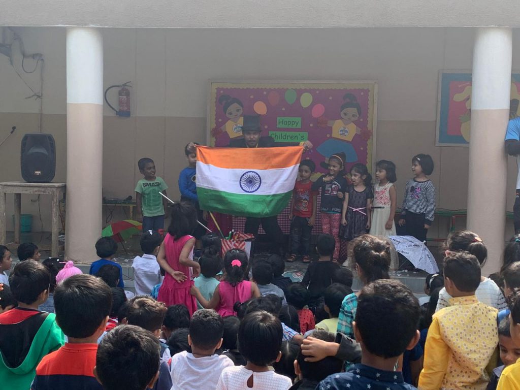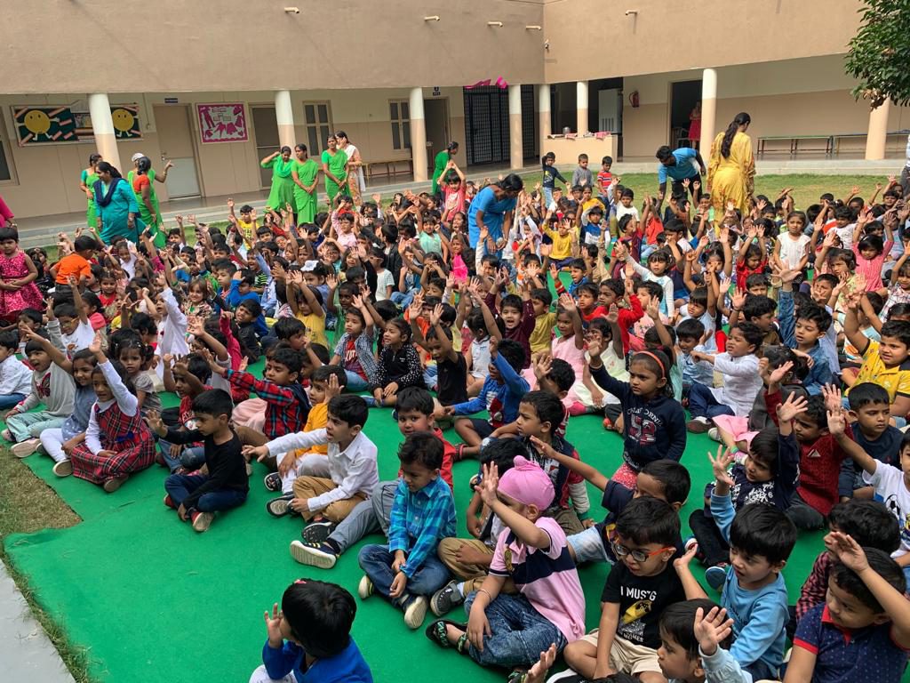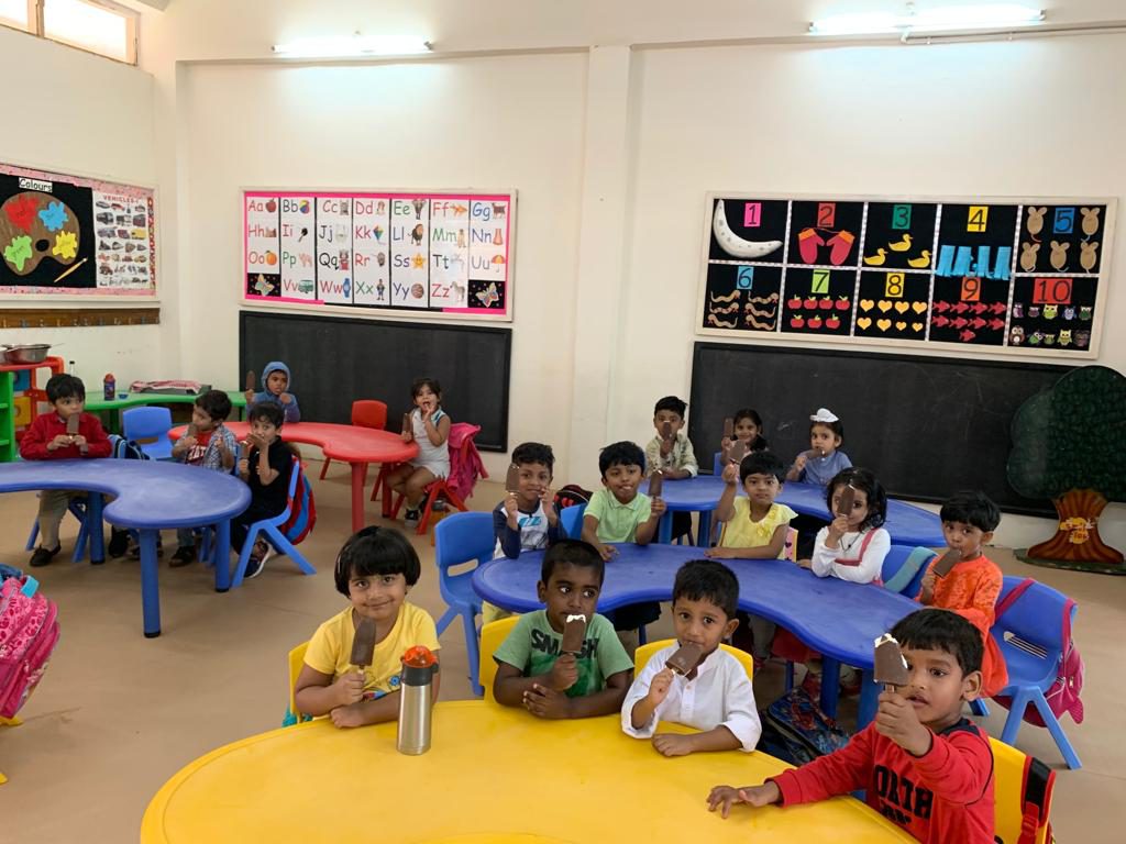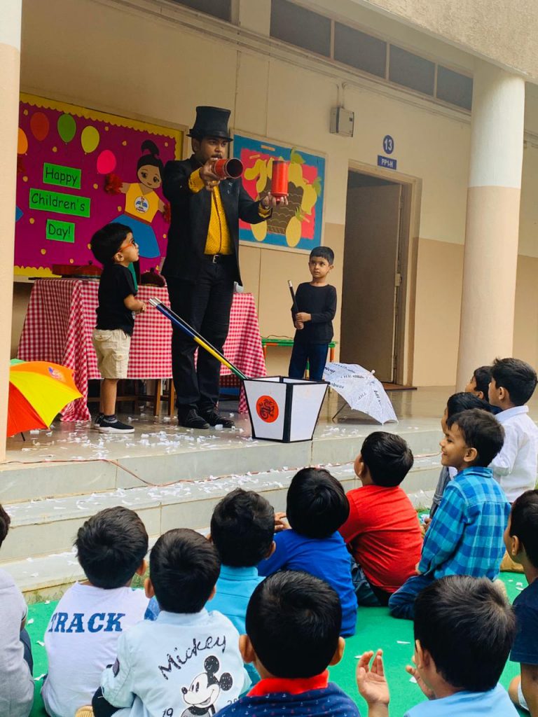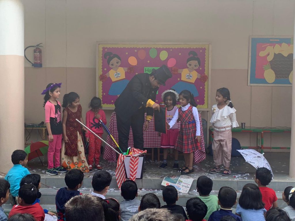 Children’s day was a grand celebration in the Pre-Primary. The day began with a morning assembly followed by the main event -A magic show which was a surprise for the children. The young ones were captivated and enthralled by the magic tricks and were more than excited to join the magician on stage and be a part of the show. After the magic show, it was time for a sumptuous meal-Chicken Biryani, Manchuria, vegetable pulao, which were part of the menu. But, the show stopper that created the most excitement was the ‘Choco bar’ ice cream! The rest of the day was spent dancing and singing along to their favourite tunes and rhymes. It was indeed a happy and special day.