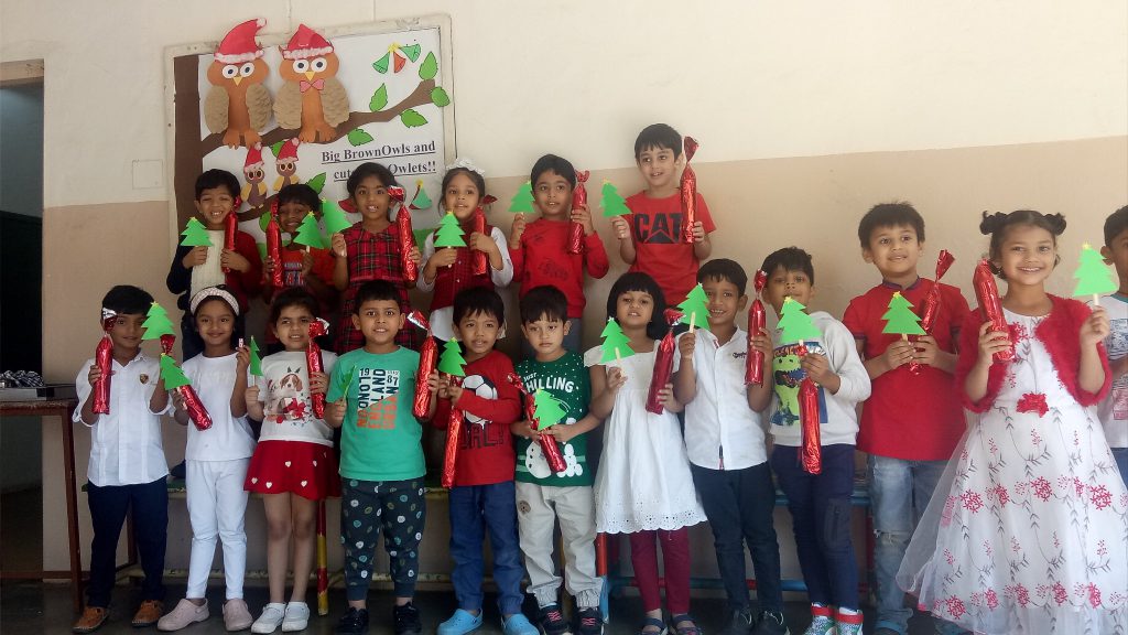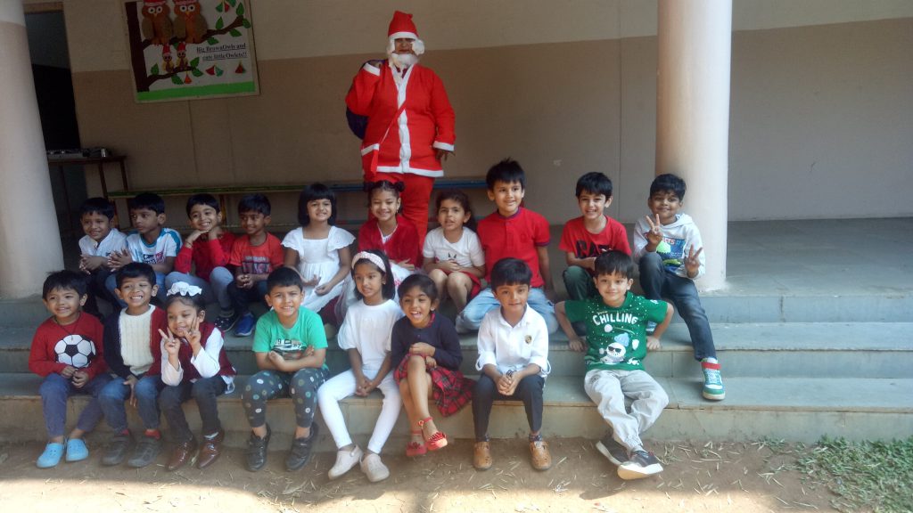 Children were also treated to some melodious Christmas carols, The strains of the iconic Christmas song- Jingle Bells, rent the air as Santa made his appearance. Innovative thinking indeed, and a thumbs up for an eco-friendly Santa!! It made their day when Santa gave each KG section a box of goodies, which the students relished during their class party. Their joy knew no bounds when Santa joined them as they danced to various Christmas carols. A most memorable day indeed for the children.