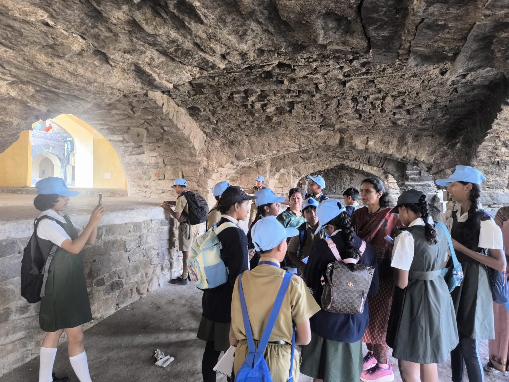 Despite the heat outside, students experienced cooler temperatures inside the palace-complex due to climate-responsive architectural features such as high ceilings, thick stone walls, and ventilation shafts, prompting discussions on eco-friendly design.The visit also offered valuable lessons in cultural integration and tolerance, with the coexistence of a Kali temple and a mosque within the fort symbolising religious harmony and mutual respect. From the summit, students enjoyed panoramic views of Hyderabad and its historic landscape.