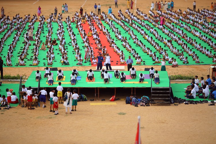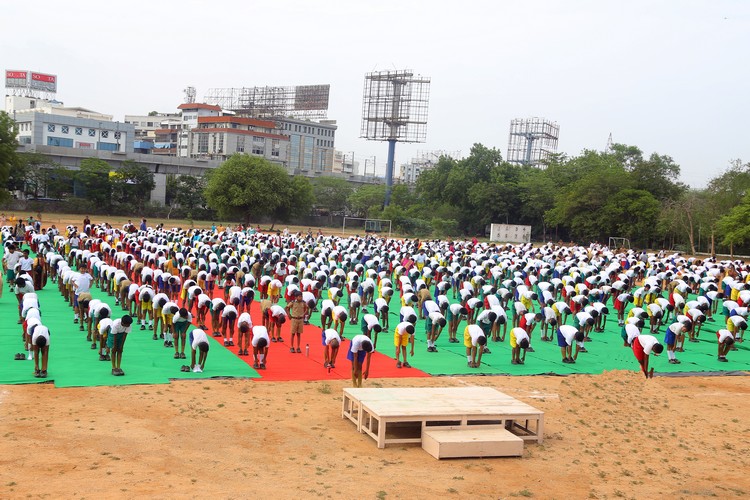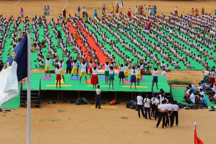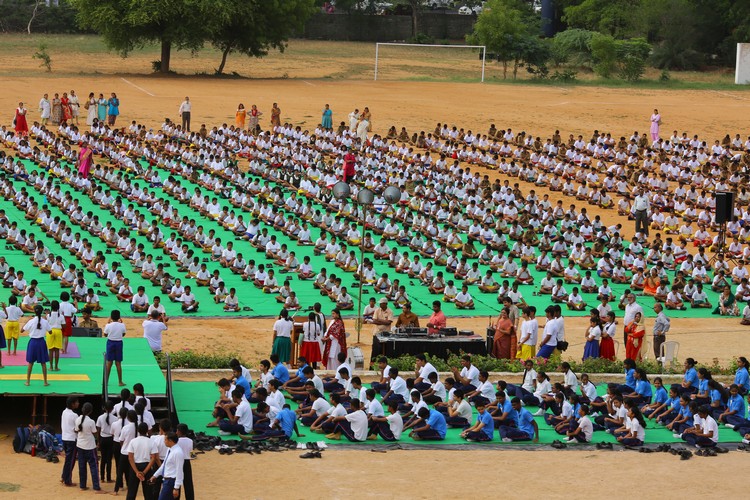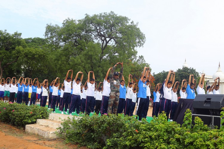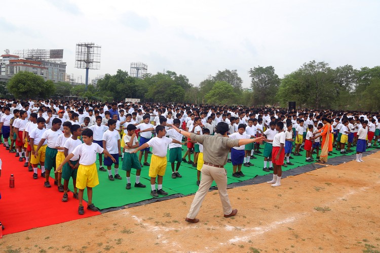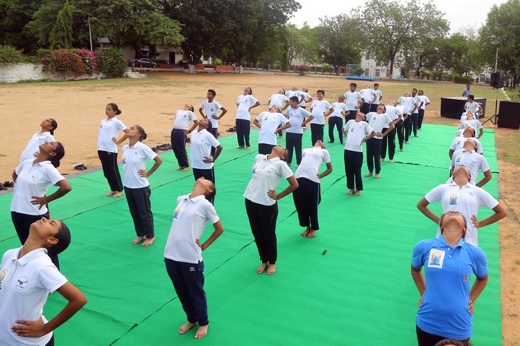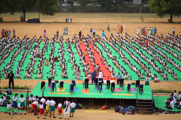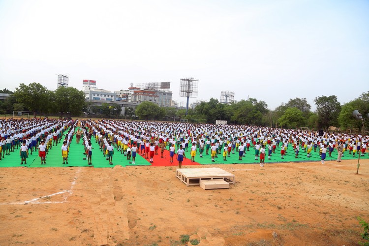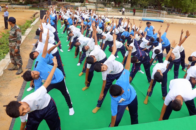 Three thousand students from Primary,Middle and Senior School performed various ‘Asanas’ , neck and body movements.150 students from all three NCC Wings performed ‘Asanas ‘which are part of their training programme.The series of advanced ‘Asanas’ and ‘Surya Namaskar’ performed by the group of students was a demonstration of flexibility and perfect synchronisation of body, mind and soul.The students from the Primary School showcased the meaning of each Asanas to the background of lyrical music.