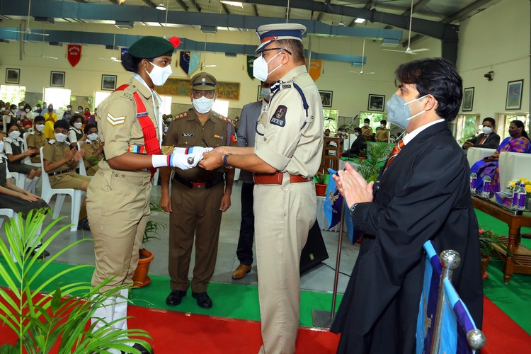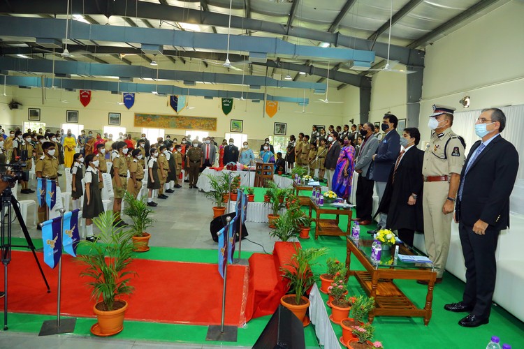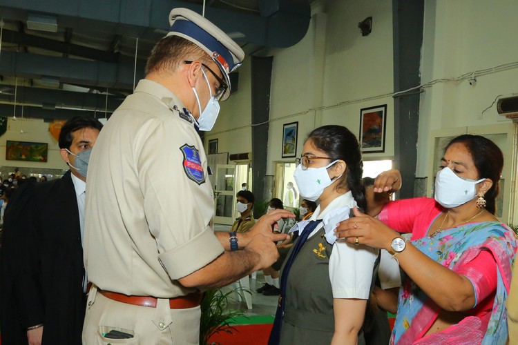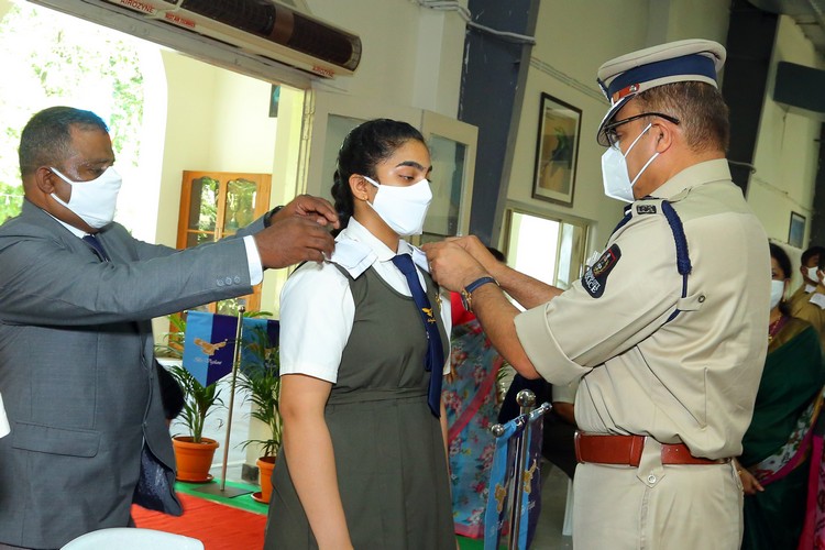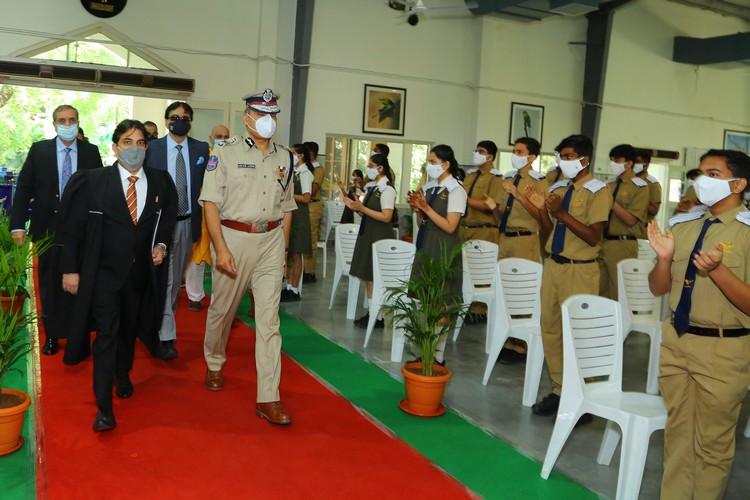 The Chief Guest was escorted by the pilots from the Air force, Army and Navy NCC wings. After unfurling the School Flag, the Chief Guest presented the N.C.C. Cane of Honour and Umesh Chandra Memorial Gold Medal for Best NCC Cadet to Ms. Charishma Killana for her exceptional accomplishment.
