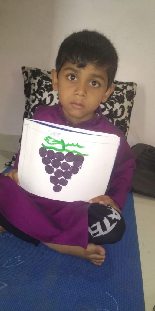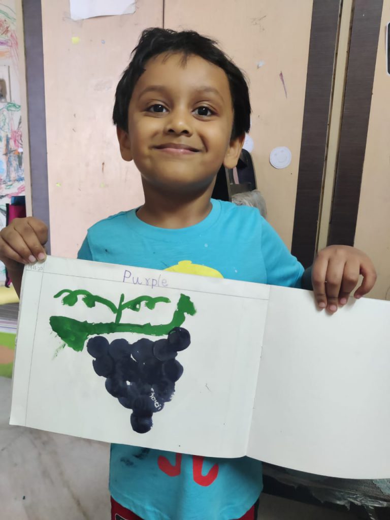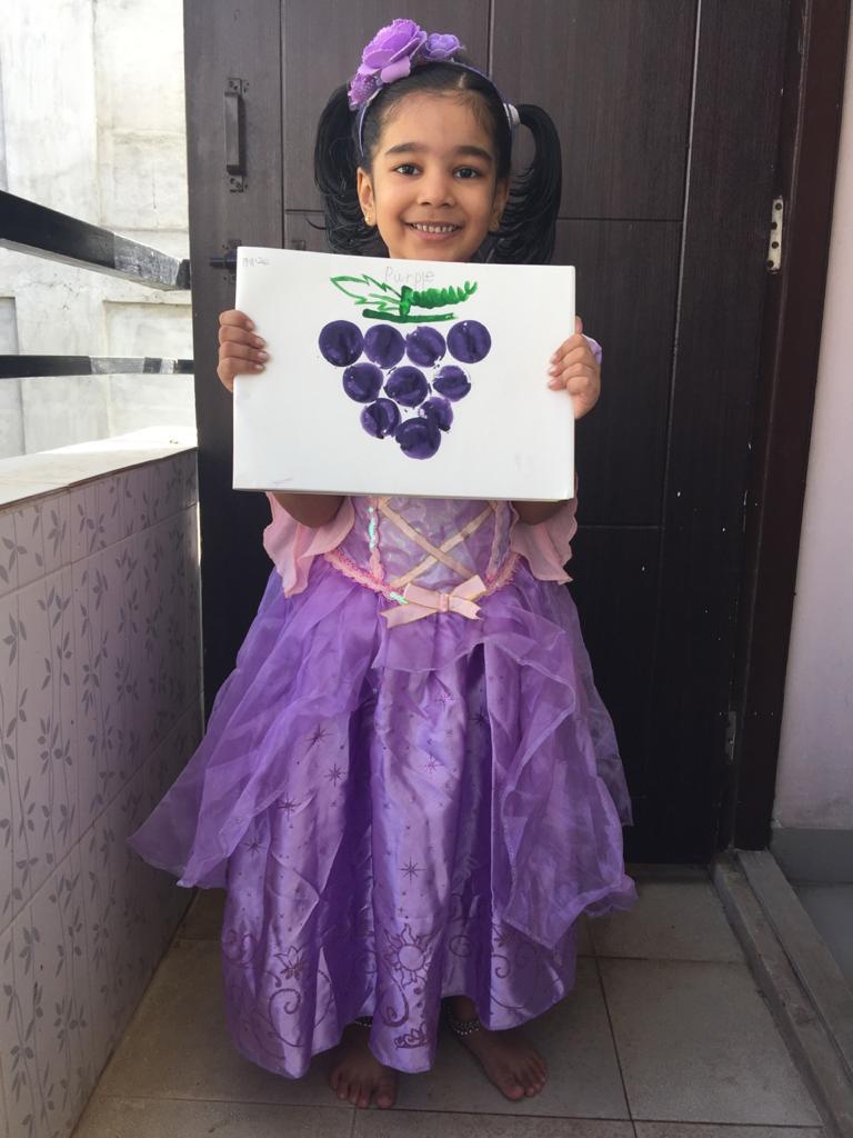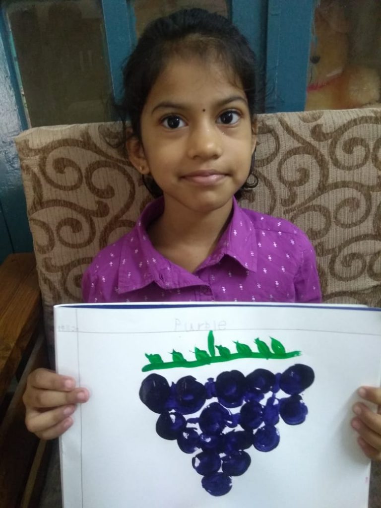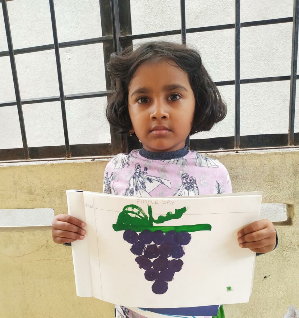Children of PP2 celebrated “Purple day” on 19th November, 2020. Children wore purple with great pride as they were told that the colour purple is associated with Royalty. Knowing about colours always brings joy to the children. They learnt that by mixing primary colours, red and blue we get purple. The children also learnt that, we get different shades of purple based on the proportions of the primary colour. Children enjoyed watching the presentation about the various articles in purple and the rhymes related to it. They finally put into action their learning of mixing red and blue to make purple. The same colour was used to make bottle cap printing activity and grapes. Everyone made grapes in different shades of purple and thus reinforcing the concept of proportions of color mixing.