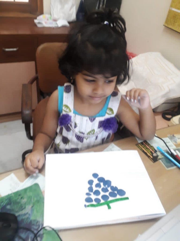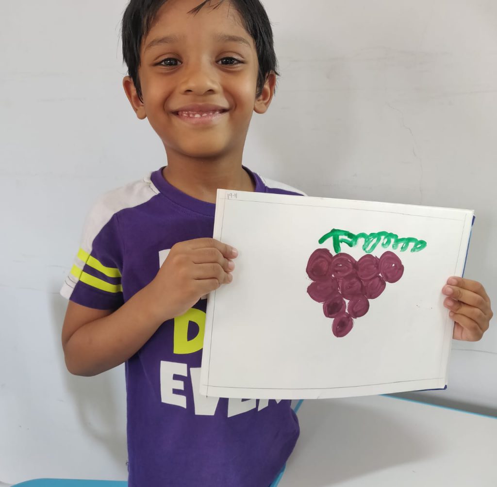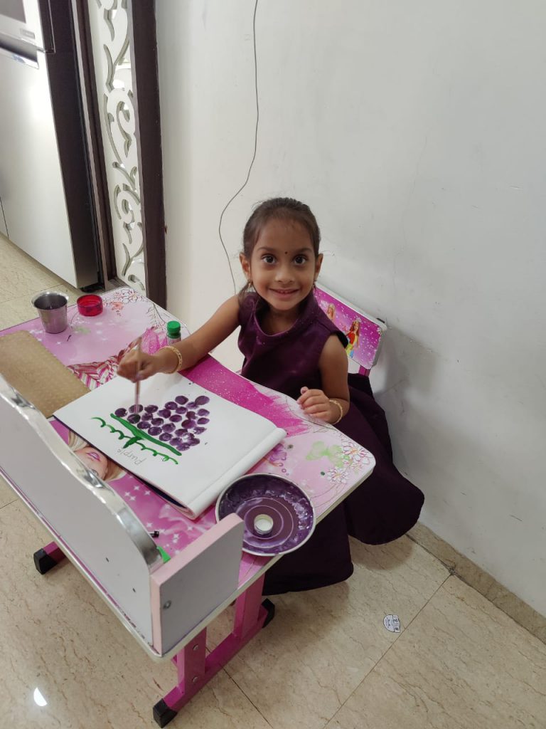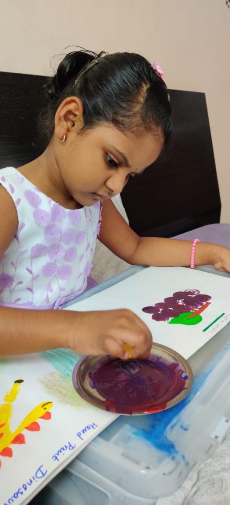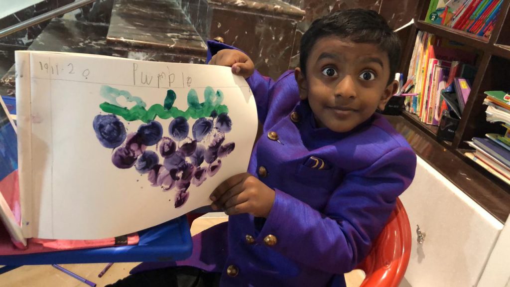 Children of PP2 celebrated “Purple day” on 19th November, 2020. Children wore purple with great pride as they were told that the colour purple is associated with Royalty. Knowing about colours always brings joy to the children. They learnt that by mixing primary colours, red and blue we get purple. The children also learnt that, we get different shades of purple based on the proportions of the primary colour. Children enjoyed watching the presentation about the various articles in purple and the rhymes related to it. They finally put into action their learning of mixing red and blue to make purple. The same colour was used to make bottle cap printing activity and grapes. Everyone made grapes in different shades of purple and thus reinforcing the concept of proportions of color mixing.