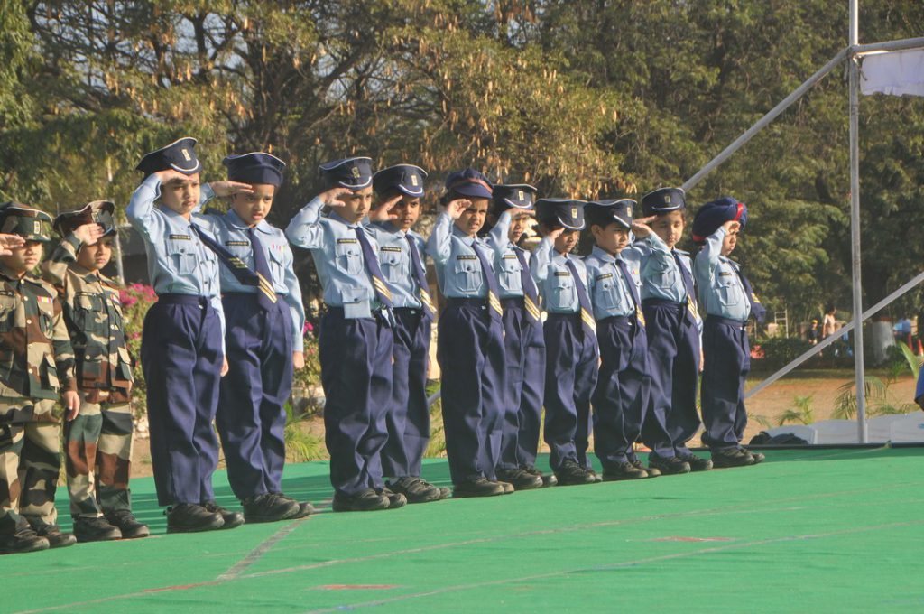 Preprimary students began the cultural programme of the day by paying tribute to the armed forces through their beautiful performance titled- “A salute to our troops.” The 43 upper kindergarten students displayed the different salutes of the tri-services dressed in the vibrant colours of the armed forces. This was followed by a medley of patriotic songs rendered by the school choir consisting of 100 children.