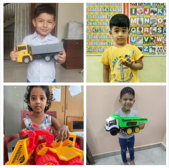 Children were shown a presentation on community vehicles to teach them about their importance. The use of emergency vehicles, such as police cars, ambulances and fire trucks, along with other service vehicles like garbage trucks was discussed. Using dough, chickpeas and rolling pins the children were taught the use of a road roller. To conclude they watched rhymes on the ‘Special Use Vehicles’.