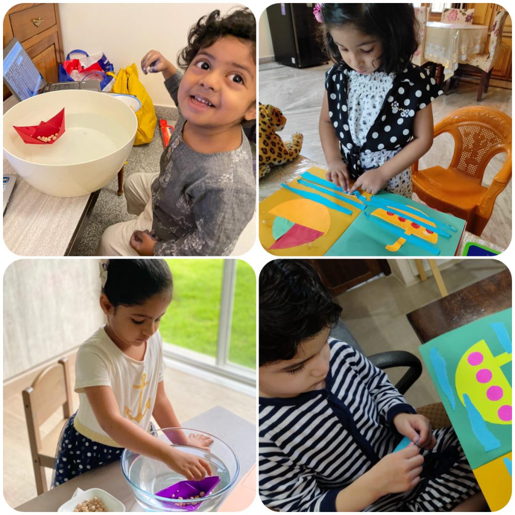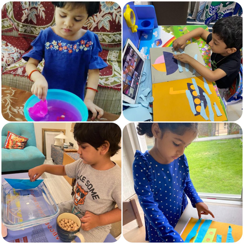 Water transport was introduced with a bowl of water and a boat in it with the teacher singing Row, row, row your boat. Children also saw a presentation on water vehicles and finished with the activity of a boat and a submarine in the scrapbook.