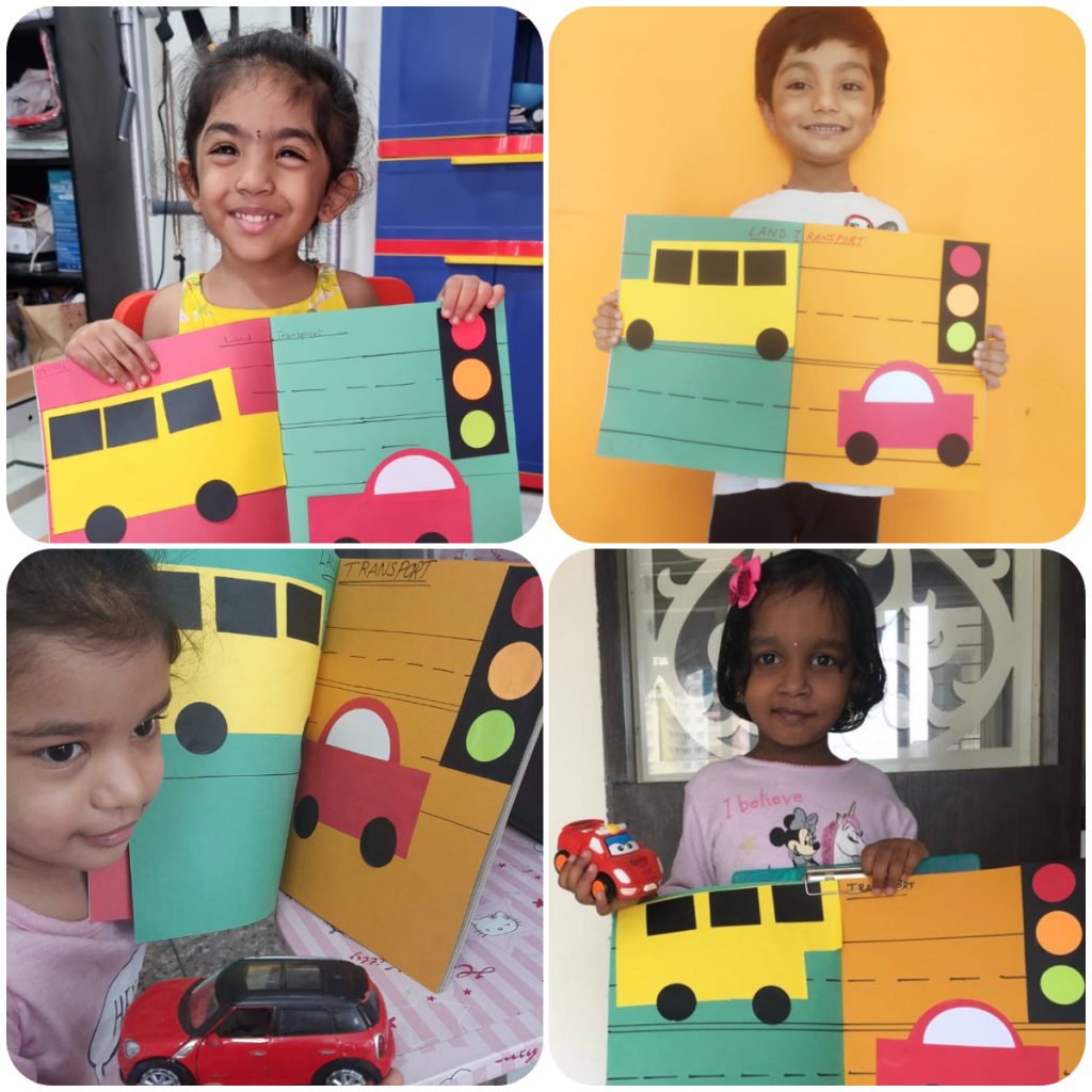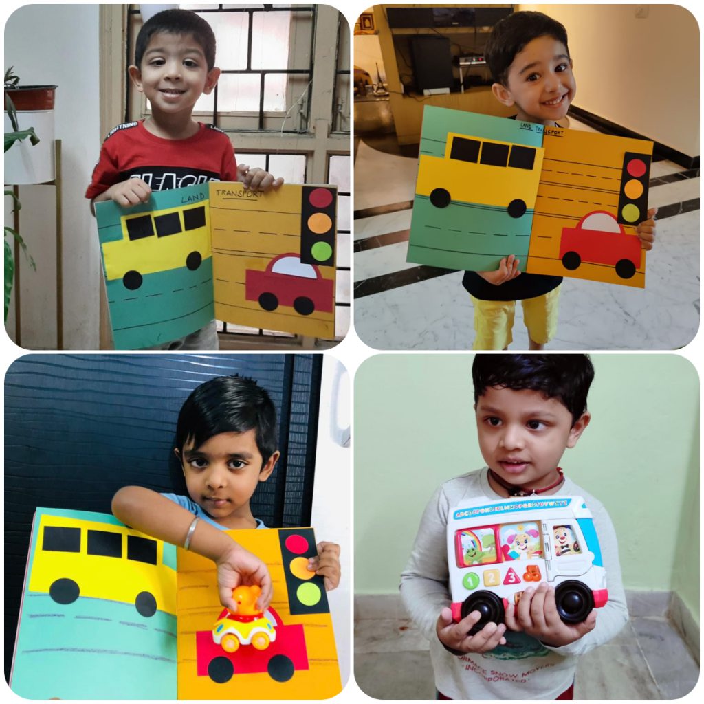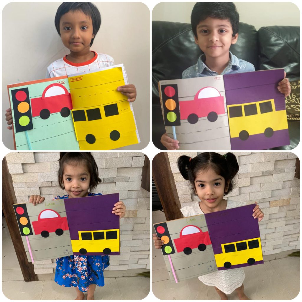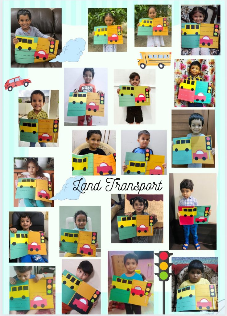 Starting from the 26th of July, children of PP1 celebrated “Transport Day”, by learning about one mode of transport each week. Children were shown presentations of land vehicles from single-wheel Unicycles to Trucks. Later they were introduced to the concept of Railways. A scrapbook activity of pasting a car, a school bus with traffic signals was done to reinforce the concept with traffic safety rules.