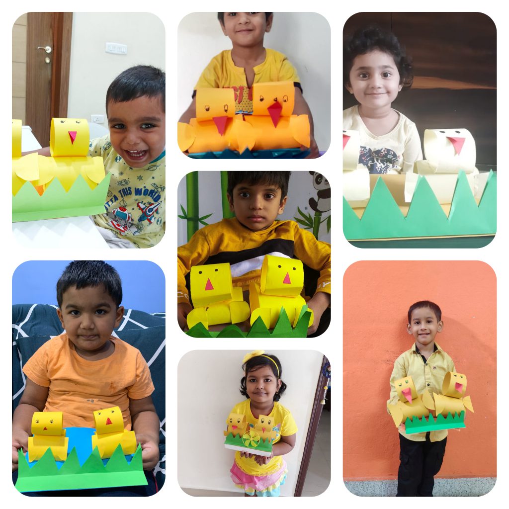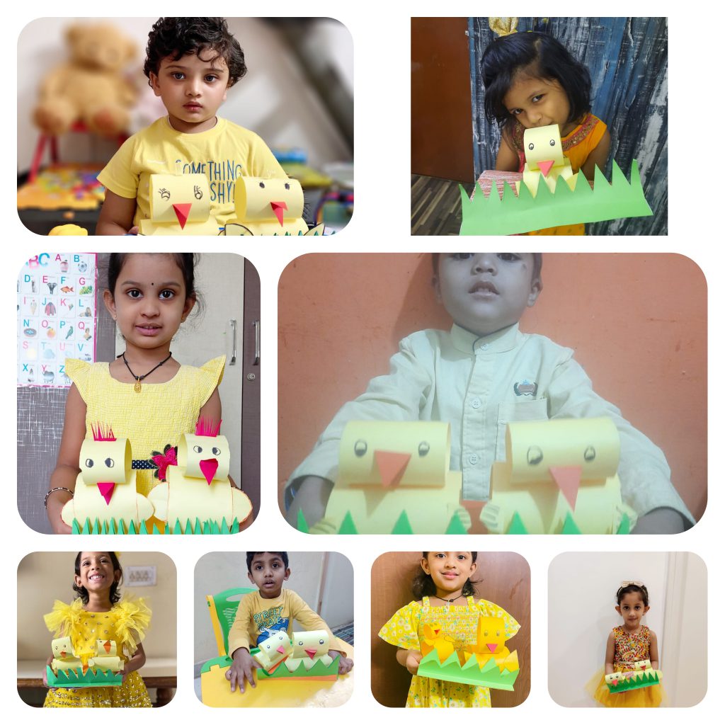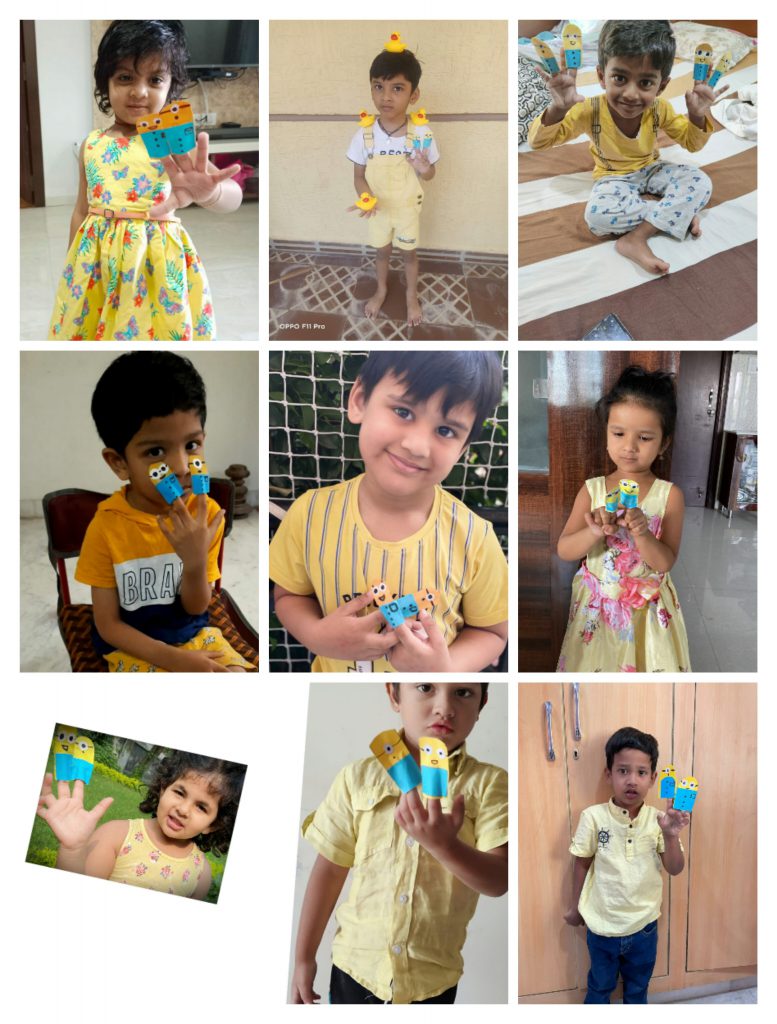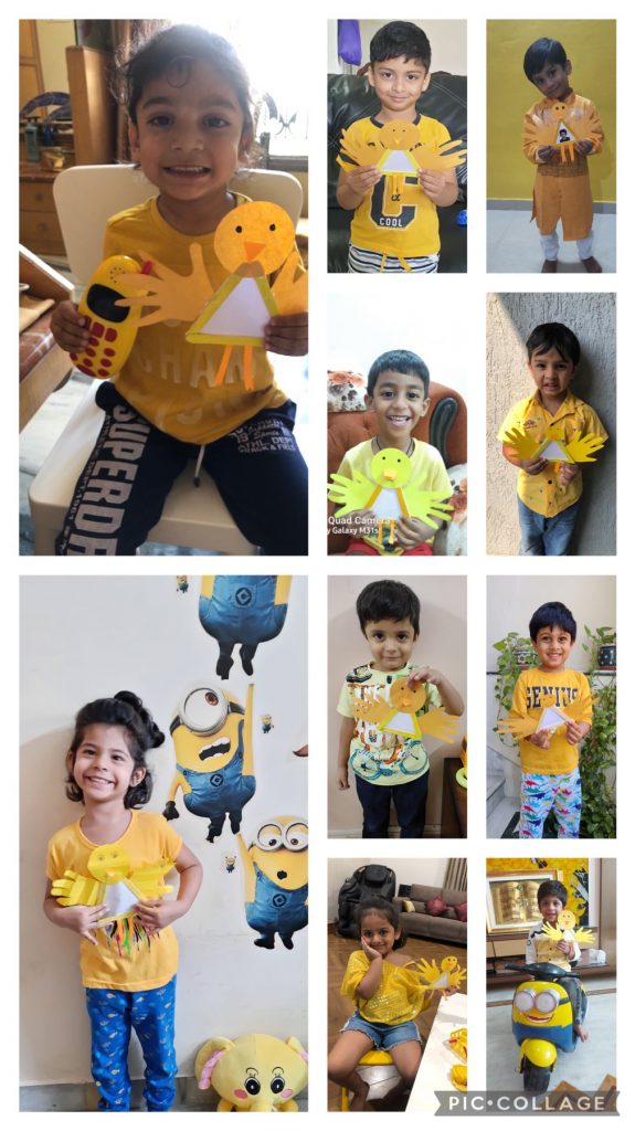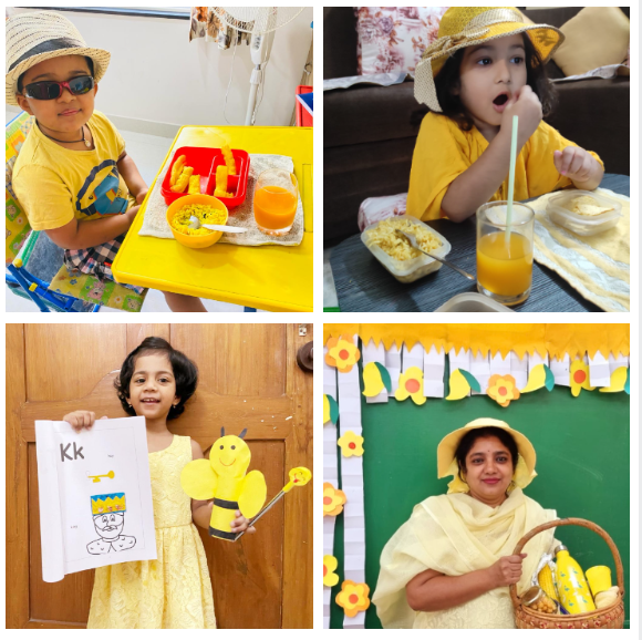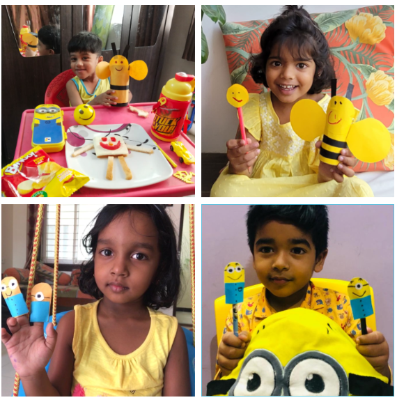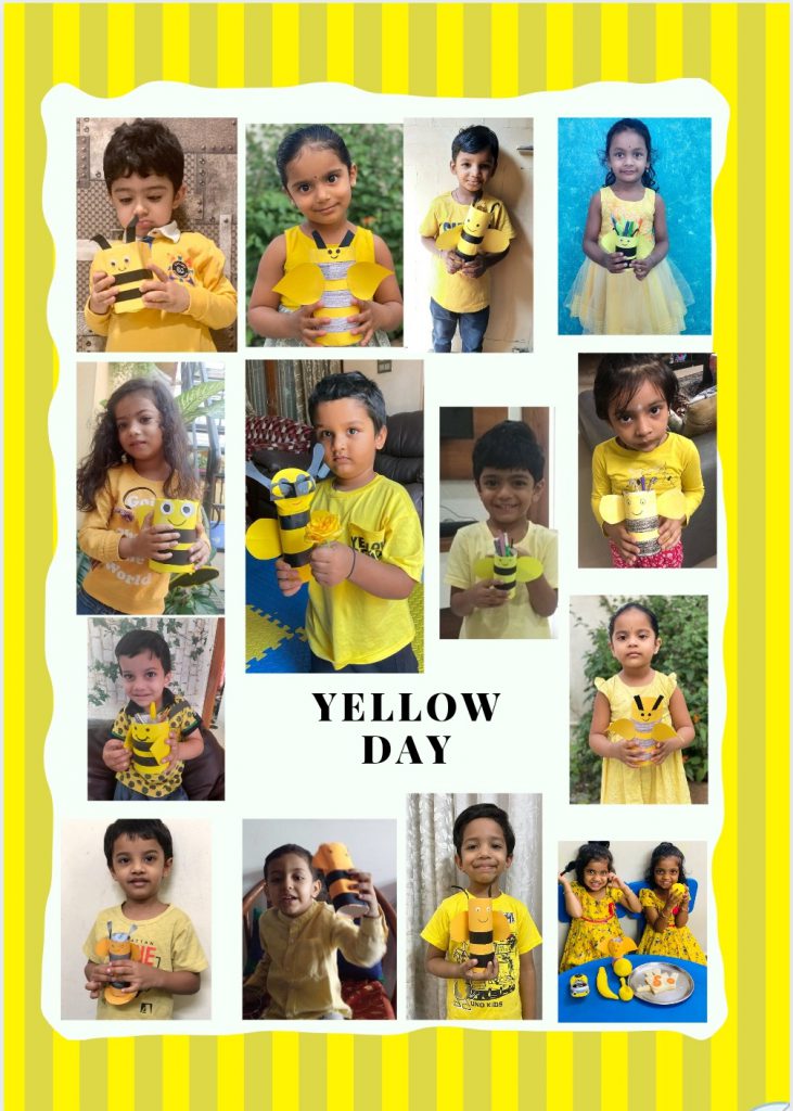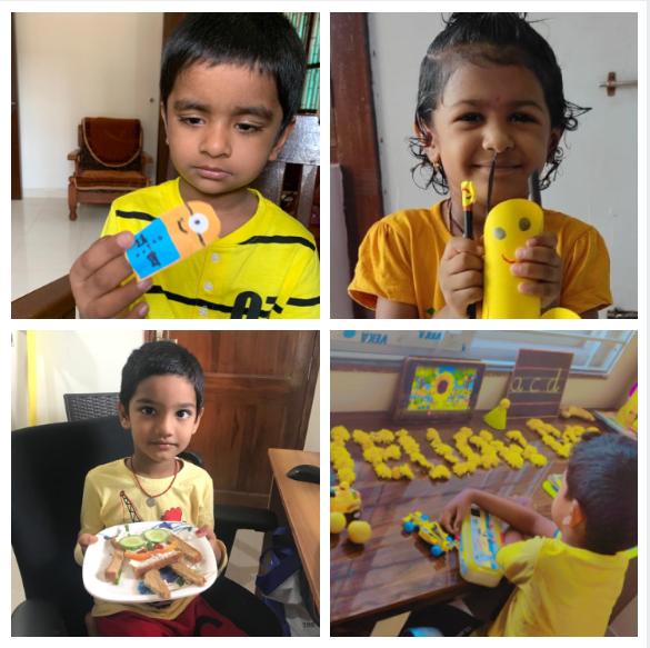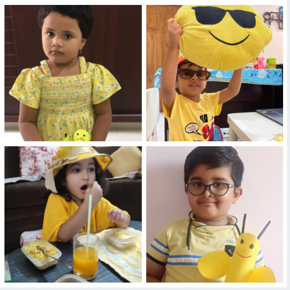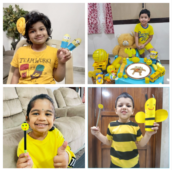 Children joined the virtual classes in different hues and tints of yellow. They were taken on a virtual picnic and shown cartoon characters, flowers and fruits that are yellow. The presentation ended with yellow rhymes and things that are in yellow. Later, they were involved in the yellow craft activity of making a bee pencil holder and a yellow pencil cap. Finally, they made a sponge bob sandwich and called it a day while enjoying the handmade snack with their friends and teacher.